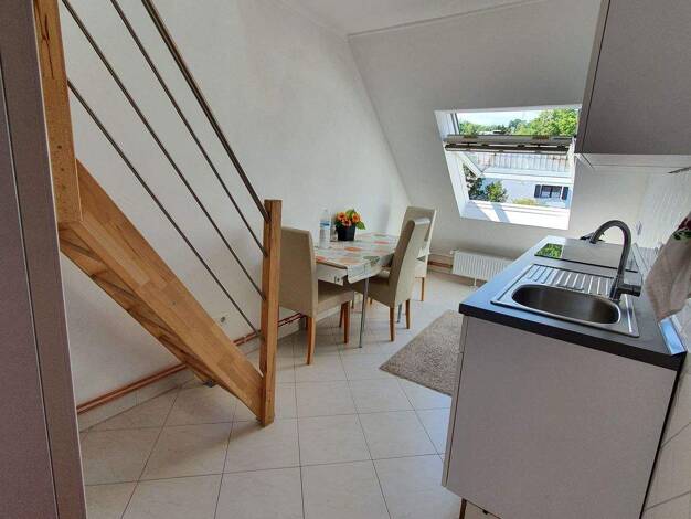 Gemütlich eingerichtete Dreizimmerwohnung über zwei Etagen in Bornheim.AusstattungWohnen: der Wohn- Essbereich ist mit mehreren Sesseln, großem Esstisch, Fernseher und Regalen eingerichtet. Die Wohnu...