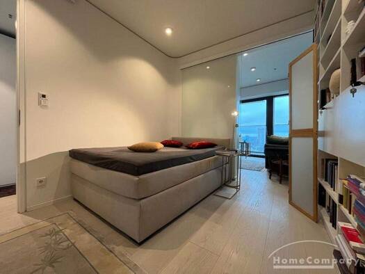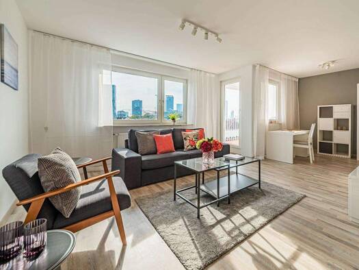 Möbliertes Wohnen in luftigen Höhen. Modernes Apartment, voll möbliert und ausgestattet im One Forty West Premium Wohnturm unweit der der Messe Ausstattung Wohnen: Offener Wohn/Essbereich mit direkte...