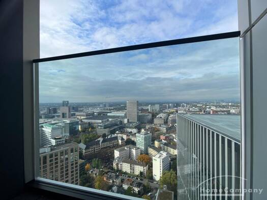 Möbliertes Apartment im 32. OG des One Forty West, einem der beliebtesten Premium-Wohntürme in Frankfurt am Main Ausstattung Wohnen: Offener Wohn/Essbereich mit direktem Blick auf die Skyline Küche: ...