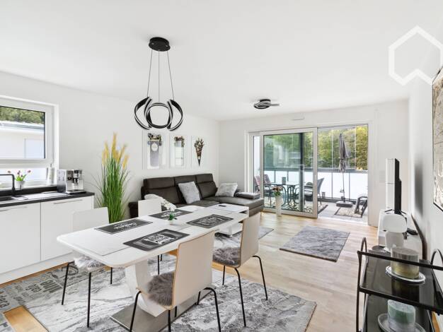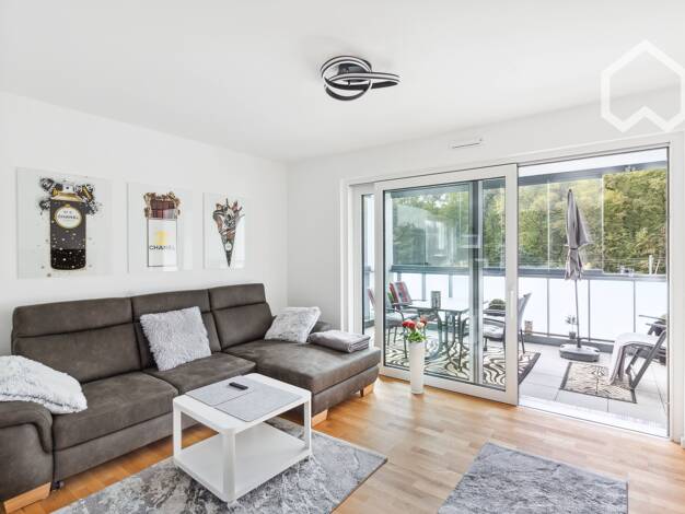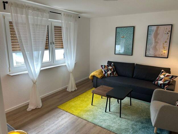 Moderne, möblierte 2-Zimmer-Wohnung in ruhiger Lage von Niederdorfelden. Vollständig möbliert - einziehen und wohlfühlen!Wohnen: Helles Wohnzimmer mit Sofa, Couchtisch, TV und Zugang zur TerrasseKüch...