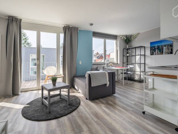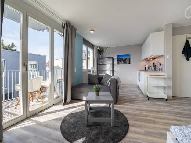 Dieses moderne & stilvoll eingerichtete Apartment besteht aus einem großen Zimmer mit sehr gut ausgestatteter Küche (Herd, Spülmaschine, Kühlschrank, Besteck, Geschirr, Töpfe, etc.), Flur & m...