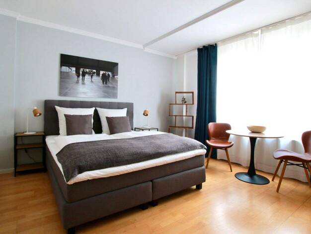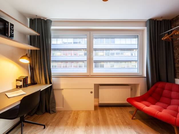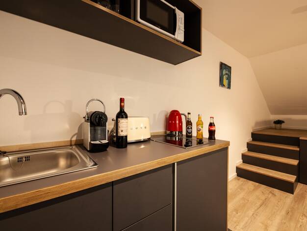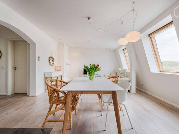 2 Schlafzimmer, eine wunderschöne Dachterrasse, Studio mit Domblick und eine hochwertige Ausstattung- dieser Wohntraum auf 2 Ebenen präsentiert sich als wahres Wohn-Schmuckstück. Sie befindet sich auf der 2. und 3. Etage eines denkmalgeschützten sanierten Altbau. Eine historische Treppe, die auch mal knarren kann, verbindet alle Levels. Die Möbel sind liebevoll ausgewählt und teilweise selbst überarbeitet worden. In der 2. Etage befindet sich die elegante Wohnküche mit 2 schwarzen Küchenzeilen,...