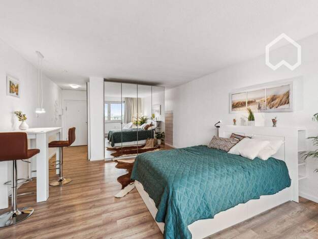 Dieses moderne & stilvoll eingerichtete Apartment besteht aus einem großen Zimmer mit sehr gut ausgestatteter Küche (Herd, Spülmaschine, Kühlschrank, Besteck, Geschirr, Töpfe, etc.), Flur & m...