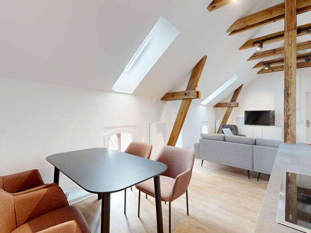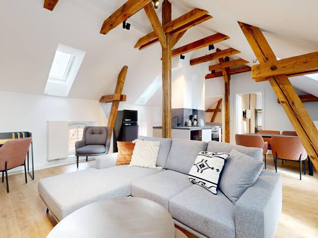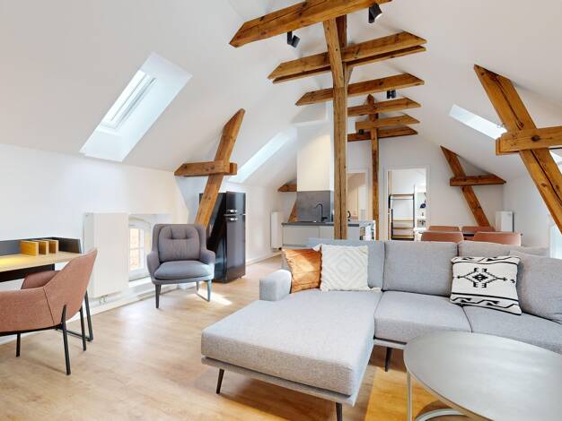 - Offene Küche mit angrenzendem Wohn- und Essbereich sowie Zugang zur Dachterrasse - Schlafzimmer mit direktem Zugang zur Dachterrasse - Badezimmer mit moderner Dusche