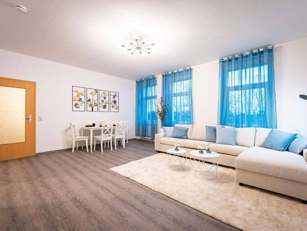 ### Please note the availability date! Bitte das Verfügbarkeitsdatum beachten! ### neu möblierte Wohnung in einer ruhigen Seitenstraße im zentrumsnahen MD-Sudenburg; Wohnzimmer mit großer Eckcouch, S...