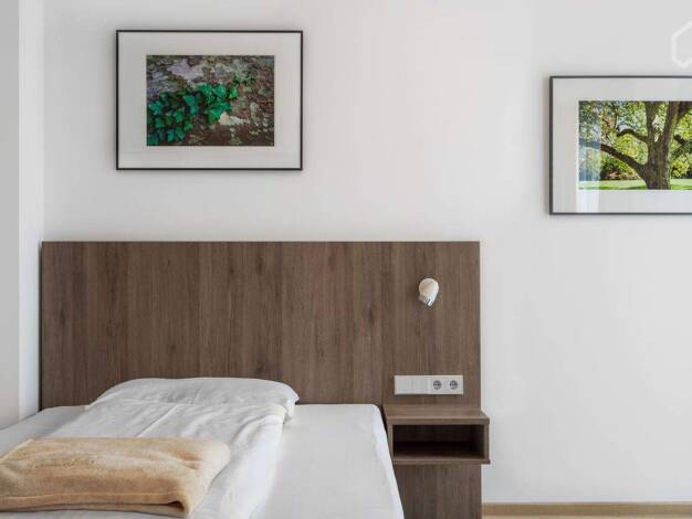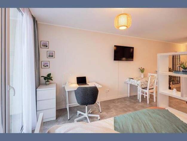 Weitere Informationen, viele hochauflösende Fotos und ein Video zu diesem Objekt finden Sie unter: https://www.mrlodge.de/wohnungen/detailansicht/14768/ See offer in English: https://www.mrlodge.com/search/detailed-view/14768/ Zimmer: Kombiniertes Wohn-/Schlafzimmer:, Sofa, Esstisch mit 2 Stühlen, französisches Bett 140 x 200 cm, Schreibtisch, Stuhl, Kommode, Regale, Bad mit Dusche Bodenbelag: Laminatboden, Fliesenboden Möblierung: neu, schön und hell eingerichtet, sehr gut Küche: zum Wohnberei...