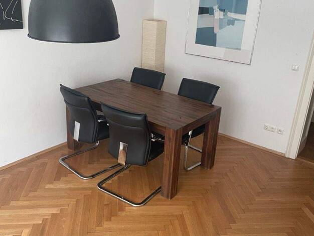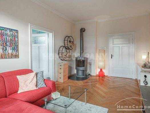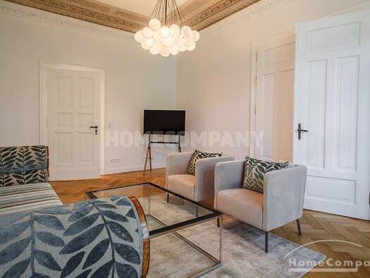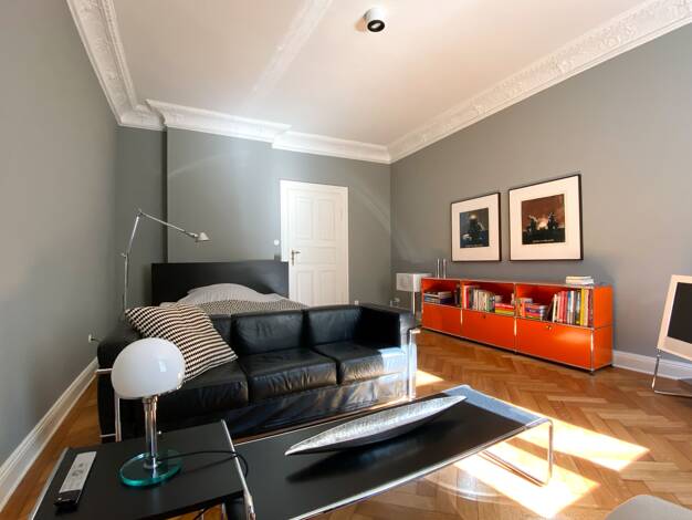 1. OG mit Aufzug. Die ca. 3 m hohen Räume schaffen in Kombination mit dem bodentiefen Fenster ein luft- und lichterfülltes Raumgefühl. Außerdem besticht die Wohnung durch die erstklassige Möblierung ...