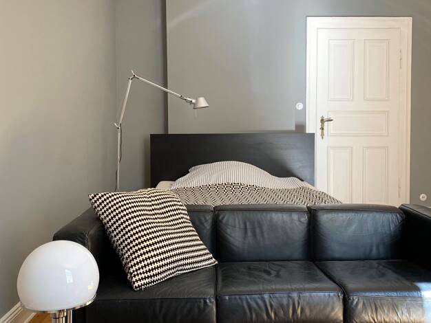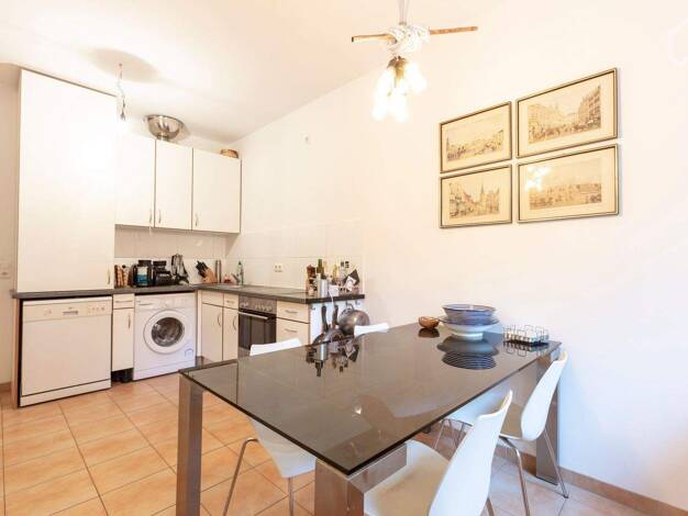 Schlafzimmer mit Doppelbett und Kleiderschrank, ruhig zum Innenhof ausgerichtet. Gästezimmer mit Einzelbettsofa, Schreibtisch und großem Schrank. Die separate, moderne Einbauküche verfügt über alles,...