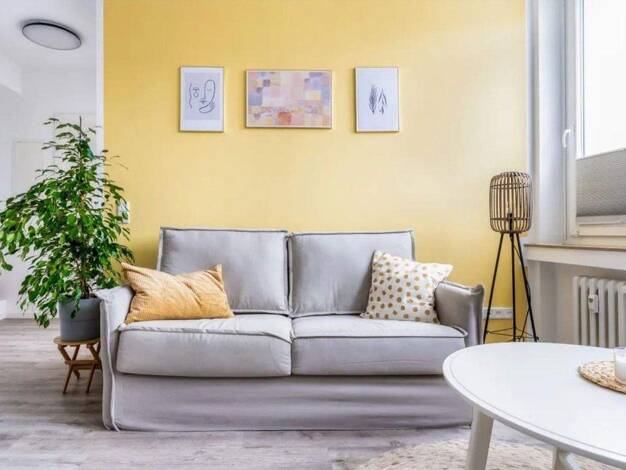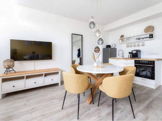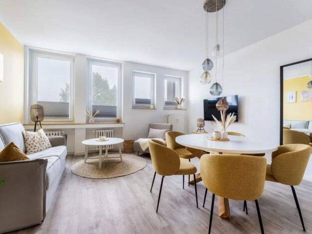 ### Please note the availability date! Bitte das Verfügbarkeitsdatum beachten! ### schicke 2-Zimmer, Dachwohnung im 2. Obergeschoss, Grundfläche ca. 60 Quadratmeter; Parkettböden; WLAN inkl; Waschmaschine im Keller; helles Wohnzimmer mit Küchen-Nische, Esstisch-Tresen, Eckcouch, Schrankwand, TV und Ausgang zum Dachbalkon; Schlafzimmer auf der Gebäuderückseite mit Doppelbett, Keiderschrank, Sideboard und TV; Bad mit Dusche, Wanne und WC; Wohnungsflur mit kleiner Garderobe; Pauschalmiete 980,00 E...