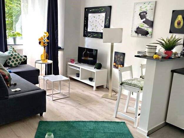 In einem charmanten 4-Parteien-Haus auf der ersten Etage befindet sich diese ruhige, gemütliche 2-Zimmer- Wohnung und verfügt über ein Schlafzimmer, ein Badezimmer sowie eine offene Pantry-Küche. Das Schlafzimmer ist mit einem franz. Bett (140 x 200 cm) sowie einem Kleiderschrank ausgestattet. Das Badezimmer verfügt über eine Dusche, eine Toilette und ein Waschbecken. Der offene Wohn- und Essbereich mit Fußbodenheizung ist mit einem Esstisch, Stühlen und einem Wohnzimmerschrank ausgestattet. Di...