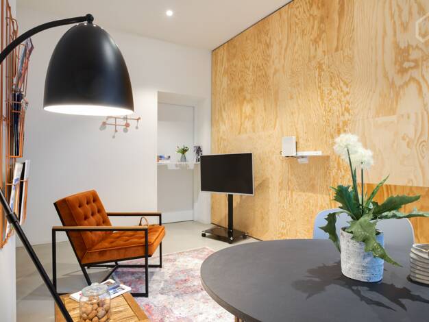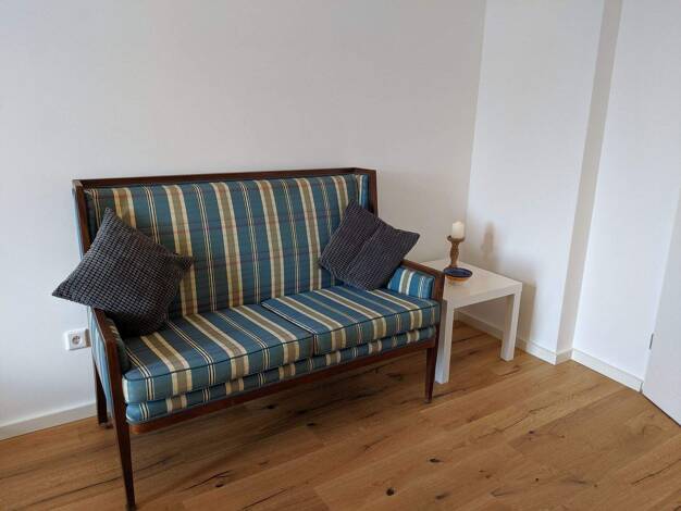Modern möbliertes Nichtraucher-Apartment für Wochenendpendler im 1. OG, sehr hell durch die bodentiefen Fenster. Wohn-/Schlafraum mit Schlafcouch, Digital-TV, Sat-TV, Vinylboden mit Fußbodenheizung, ...