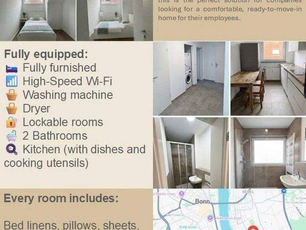Adresse: Bornheimer Str. 80, 53111 Bonn ? Einzug: 01.12.2025 ? Zimmer: 13,5qm, gut geschnitten, möbliert ? Miete: 500,00€ + NK 120,00€ + 29,00€ Möblierungspauschale = Warmmiete 649,00€ ?ink. W-Lan, Strom und allen anderen Nebenkosten Kaution: 1.500,00€ ?? Ausstattung ? Voll ausgestattete Küche (Herd/Ofen, Kühlschrank, Geschirrspüler) ?Im Keller ist ein Waschraum mit Waschmaschinen & Trockner ausgestattet. ?Bad mit Badewanne, ?WLAN und Strom inklusive, ?? Lage ?Top Anbindung: ÖPNV fußläufig,...