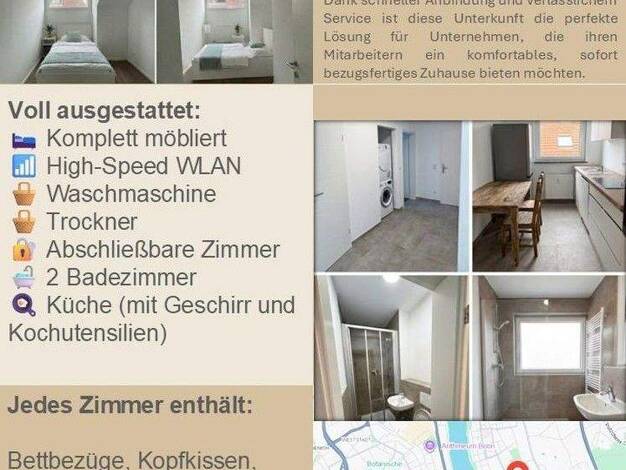 Unsere helle, modern eingerichtete Wohnung bietet 4 vollständig möblierte Zimmer - ideal für eine Mädchen WG, Monteure, Fachkräfte oder Mitarbeiter von Firmen oder Kliniken. Die ruhige Lage, die hochwertige Ausstattung und die gepflegten Gemeinschaftsbereiche sorgen für ein angenehmes Wohnen auf Zeit. Dank schneller Anbindung und verlässlichem Service ist diese Unterkunft die perfekte Lösung für Unternehmen, die ihren Mitarbeitern ein komfortables, sofort bezugsfertiges Zuhause bieten möchten. ...