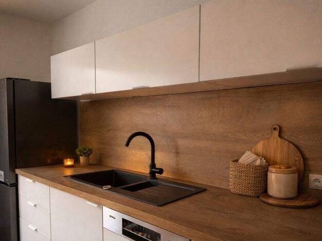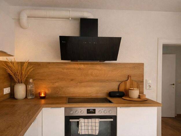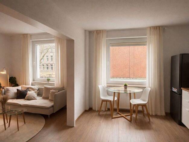 1 Zimmer, Flur, Bad, ca. 37 qm gesamte Wohnfläche, Mini Einbauküche, 2 flammiges Cerankochfeld, Kühlschrank mit Gefrierfach. Hängeschrank mit Beleuchtung. Bad mit Badewanne und Duschvorrichtung; weisse, diagonal verlegte Fliesen in der gesamten Wohnung. Großer Abstellraum von 7 m2 auf derselben Etage, sehr grosse Loggia. Das Haus ist aus dem Jahre 1970 hat 81 Wohneinheiten - diese Wohnung liegt auf der Südwestseite. Das ganze Anwesen hat einen Boardinghouse Character, erinnert ein bisschen an e...