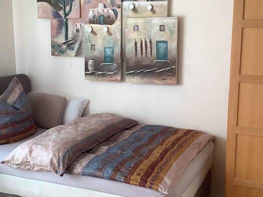 großzügige und ruhige 3-Zimmer-Wohnung in Stuttgart-Möhringen, 1. OG, ca. 84 m², Schlafzimmer mit Doppelbett, Schlafzimmer mit Schlafcouch, Wohnzimmer mit Couch, Einzelbett, Esstisch, TV, WLAN; Terra...