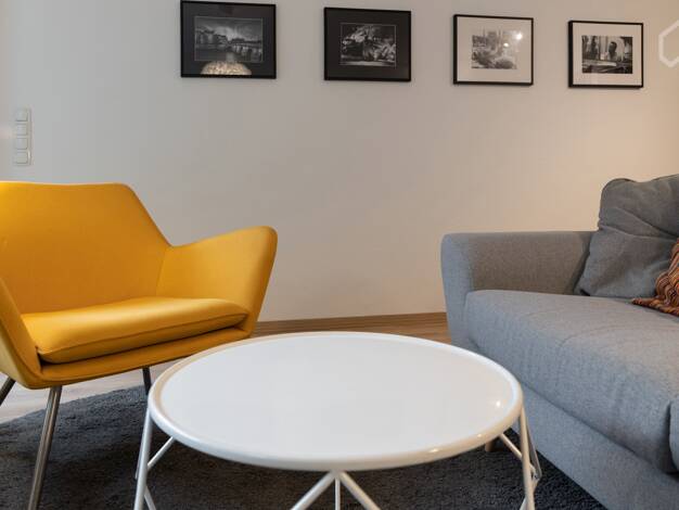 Modern möbliertes Nichtraucher-Apartment für Wochenendpendler im 1. OG, sehr hell durch die bodentiefen Fenster. Wohn-/Schlafraum mit Schlafcouch, Digital-TV, Sat-TV, Vinylboden mit Fußbodenheizung, ...