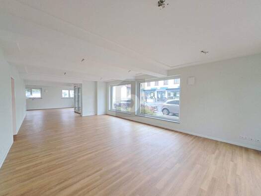 Die Ladenfläche besticht durch eine großzügige, bodentiefe Schaufensterfront, die für eine sehr gute Sichtbarkeit, viel Tageslicht und eine hochwertige Präsentation sorgt. Die Raumwirkung wird durch ...