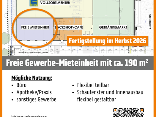 Objektbeschreibung Flexibel teilbare und gestaltbare Gewerbefläche in Steinach Im Herbst 2025 starten die Bauarbeiten für den Neubau des neuen EDEKA Vollsortimenters mit Getränkemarkt und Bäckerei in...
