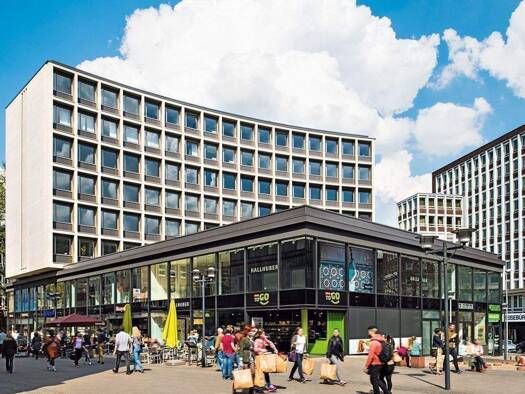 Der Gebäudekomplex besticht mit seiner zurück liegenden ,prägnanten Hochhaus-Fassade aus den 1950er Jahren. In dem an der Fußgängerzone anderthalbgeschossigen Sockelbau, befinden sich einige Ladenlo...