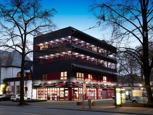 Der Geäudekomplex besticht mit seiner prägnanten Hochhaus-Fassade aus den 1950er Jahren inklusive eines anderthalbgeschossigen Sockelbaus. Im Rahmen einer 18-monatigen Sanierung wurde das unter Denk...
