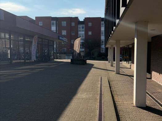 Einzelhandels-Läden mit großzügigen Schaufenstern direkt im Einkaufszentrum Rhen. Supermarkt REWE. Arztpraxen. Wochenmarkt auf dem Vorplatz. Große Parkplatzanlage. Öffentliche Stellplätze.