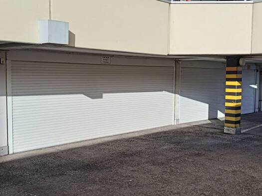 Abgeschlossenes Parkhaus mit mehreren Parkebenen. Zufahrt mit elektrischem Rolltor. Durchfahrtshöhe: 193,5 cm