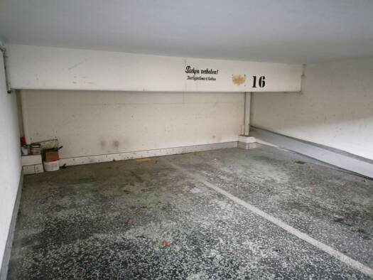 Abgeschlossenes Parkhaus. Stellplatz in der Endetage, ohne Dach - offen Stellplatz - Zufahrt mit elektrischem Rolltor. Durchfahrtshöhe: 193,5 cm