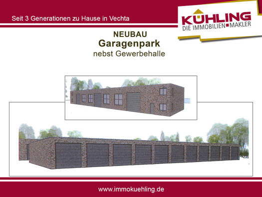 Auf dem Grundstück der neu gebauten Energie-Effizienz-Lagerhalle im Industriegebiet von Twistringen befinden sich auch 6 Garagen-Neubauten bzw. multifunktionale Lagerräume mit jeweils ca. 64qm Nutzfl...