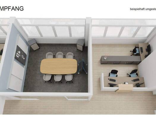 Das Büro besteht aus zwei großen Räumen, bei dem der größere Raum durch einen Raumteiler nochmal unterteilt werden kann. Der Empfangsbereich ist großzügig gehalten und mit einer Theke versehen. Diese...