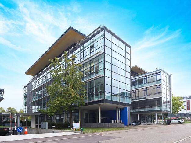 Das Gebäude im Office Center Leinfelden-Echterdingen weißt eine Quadratförmige Architektur auf. Insgesamt vier Gebäudetrakte werden von zwei sich kreuzenden verglasten Hofgängen verbunden. Das Gebäud...