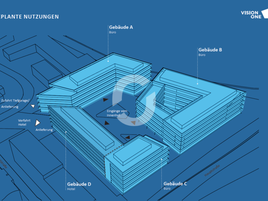 Durch das Neubauprojekt "VISION ONE" werden moderne Arbeits- und Lebenswelten geschafften. Das Ensemble, bestehend aus drei Bürogebäuden mit einer Gastronomie sowie einem Hotelgebäude, verfügt über e...