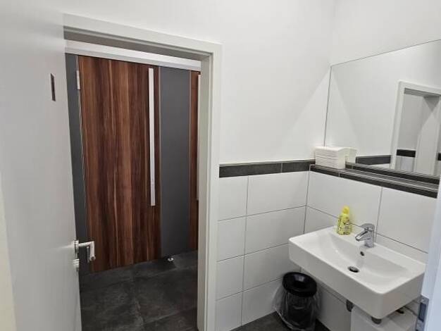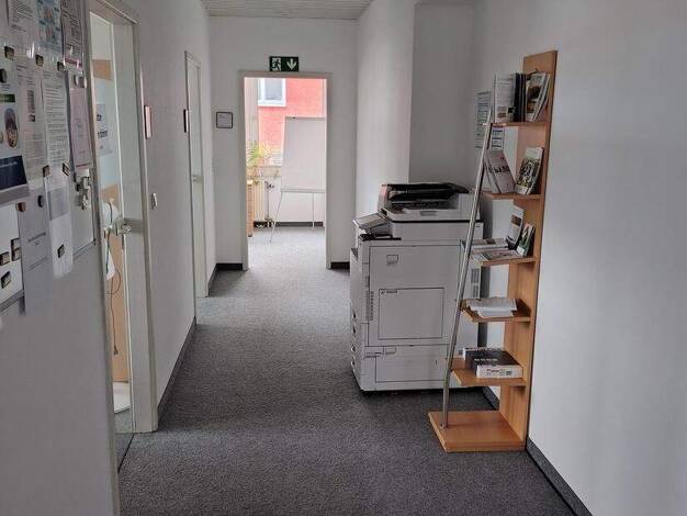 Zur Untervermietung steht ein helles Büro im 1. Obergeschoss mit insgesamt 117,14m². Die Fläche bietet 4 helle Büroräume, ein Empfangsbereich, eine Küche und getrennte Damen- und Herren Toiletten. Di...