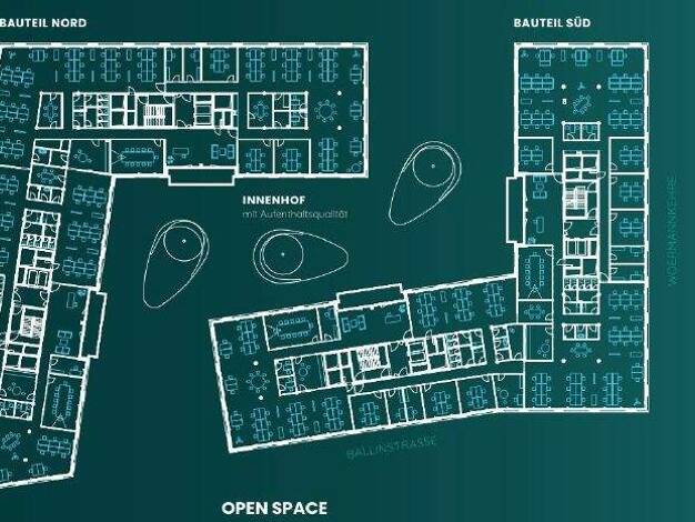 Der Neubau wurde als ein Ensemble zweier Gebäudekörper entworfen, die jeweils 7 große Geschosse bieten. Ein großzügiger begrünter Innenhof sorgt für viel Licht in den Büros und eine hohe Aufenthaltsq...