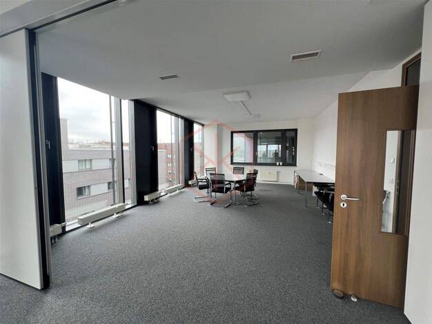 In diesem modernen Büro findest du eine einladende Atmosphäre, die durch die hellen und großzügigen Räume geprägt wird. Die raumhohen Fenster lassen nicht nur viel Tageslicht herein, sondern bieten a...