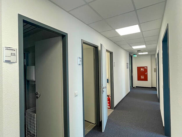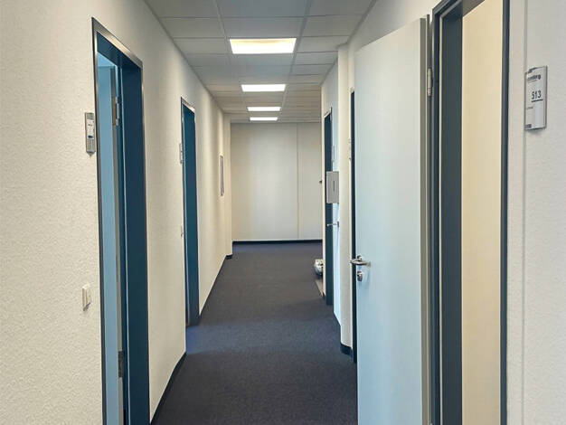 Die Gewerbeeinheit verfügt über einen langen Flur, von dem aus man in jeden der insgesamt fünf Büroräume gelangt. Hier sind zwei getrennte WCs sowie ein kleiner Abstellraum enthalten. Die Büroräume e...