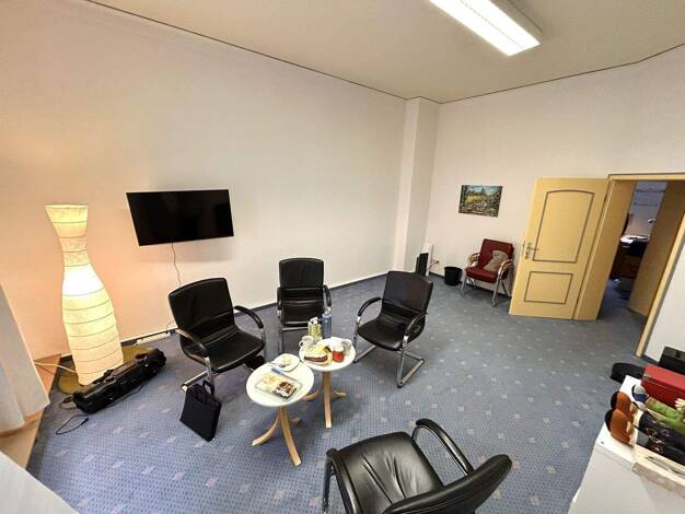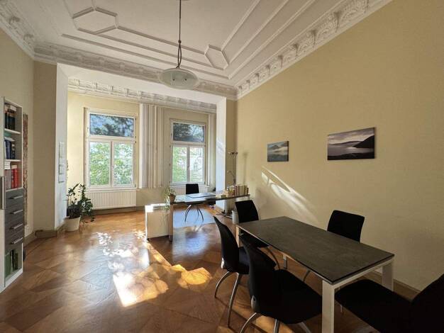 Diese ansprechende Gewerbeeinheit mit einer Nutzfläche von ca. 113,00 m² befindet sich im 1. Obergeschoss eines repräsentativen Gebäudes im Gründerzeitstil mit barocker Fassade. Die Einheit kombinier...