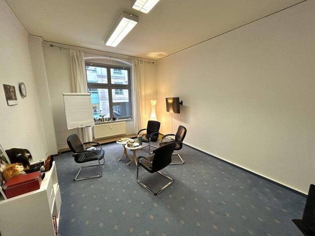 Objektbeschreibung Saniertes und gepflegtes Geschäftshaus am Hasselbachplatz. Raumaufteilung Dieses Ergeschoss-Büro mit seperatem Eingang bietet 2 große offene Räume mit einem Fliesenfußboden, Decken...