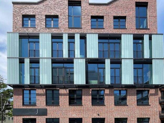 Industrie Chic Neubauimmobilie Fassade in Backsteinoptik mit vielen Glaselementen Teils Fensterfassade mit partiell vorgehängten Profilitglaspaneelen Repräsentative 2-geschoßige Eingangshalle mit Gal...