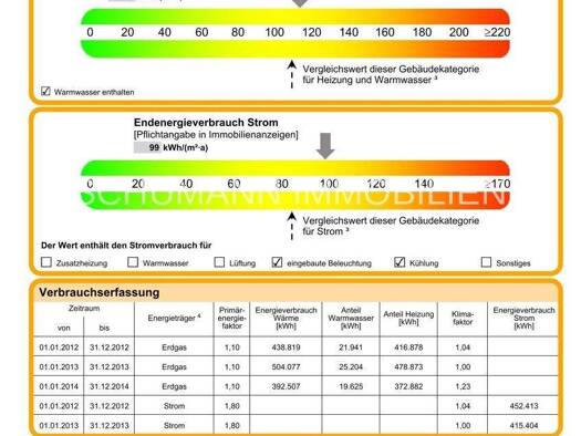 Objektnummer: F042 Art des Energieausweises: Bedarfsausweis Endenergiebedarf für Strom in kWh / (m²a): 204,6 Endenergiebedarf für Wärme in kWh / (m²a): 56,3 Wesentlicher Energieträger der Heizung: Er...