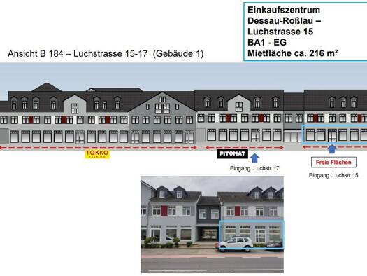 Gewerbefläche mit Top-Lage an der B184 in Dessau-Roßlau! Die vakante Gewerbeeinheit mit ca. 216 m² Mietfläche befindet sich im Erdgeschoss eines Geschäftshauses in der Luchstraße. Die Lage an der hoc...
