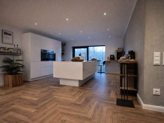 Über den großzügigen Flur gelangt man in den zentralen, lichtdurchfluteten Büroraum, der dank großer Velux-Dachfenster eine angenehme Arbeitsatmosphäre bietet. Der vorhandene Kaminofen setzt einen be...