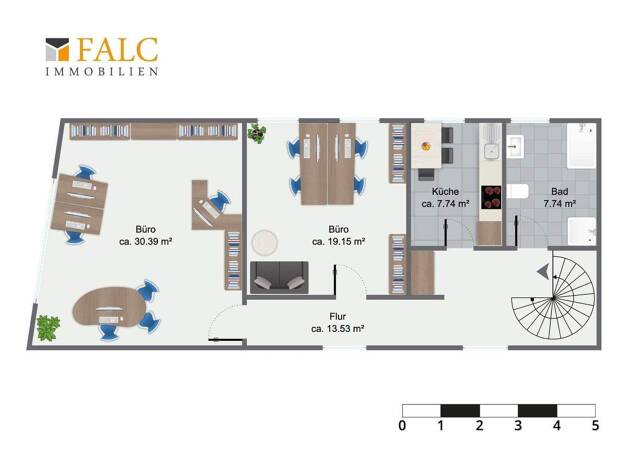 Diese attraktive Büroetage eignet sich ideal für verschiedene interessante Geschäftsbereiche. Über das Treppenhaus gelangen Sie im 1. OG über den Hausflur zum Eingang der Büroeinheit. Nach dem Betret...