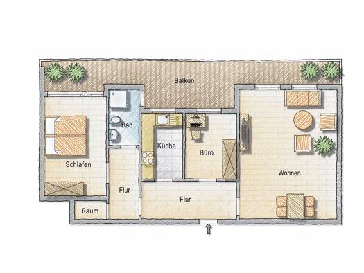 Objektreferenz: 6864 Die Wohnung überzeugt mit interessanter Raumaufteilung über zwei Ebenen: Ebene 1: große Diele, Gäste-WC, halboffene Küche, Wohnbereich mit Zugang zur umlaufenden Terrasse und Schlafzimmer Ebene 2: Flur, Schlafzimmer, Badezimmer, Abstellraum Zu jeder Wohnung gehört ein PKW-Stellplatz im Hof.