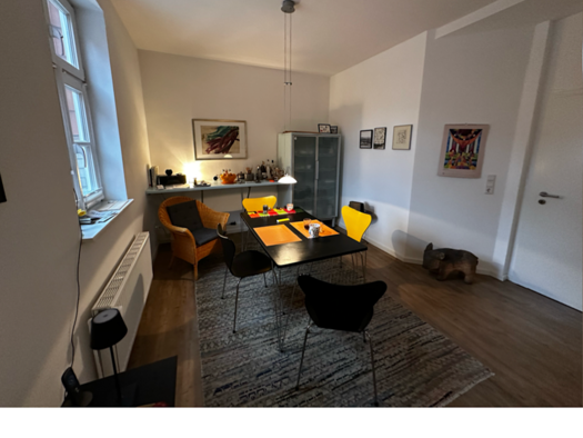 Die 2,5-Zimmer-Wohnung befindet sich im 2. Obergeschoss eines Mehrfamilienhauses. Ein Dachboden, ein Kellerraum und ein Stellplatz vor dem Haus gehören zur Wohnung. Die Wohnung ist in zwei große Zimmer, ein kleines (halbes) Zimmer, eine Küche (mit Einbauküche), ein innenliegendes Bad und einen Flur aufgeteilt.