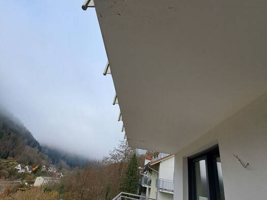 Die Wohnung verfügt über eine abgeschlossene komplett eingerichtete Küche mit Fenster, ein Bad mit Badewanne und Fenster sowie über einen Südbalkon mit Blick über Liebenzell.
