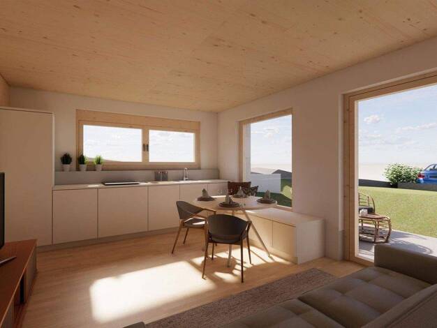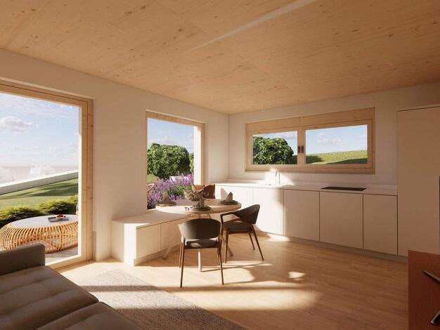 Diese charmante 2-Zimmer-Wohnung im Untergeschoss bietet modernen Wohnkomfort in nachhaltiger Holzbauweise und den idealen Rückzugsort für Paare oder Singles. Der offene Wohnbereich mit direktem Zuga...