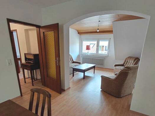 +++++++ Dieses Objekt kann nur möbliert angemietet werden +++++++ Diese schöne 2-Zimmer-Dachwohnung befindet sich im Dachgeschoss eines Dreifamilienhauses in Rheinfelden- Adelhausen. Die Wohnung bietet ein Wohnzimmer mit halboffener Küche, ein Schlafzimmerin, ein Badezimmer und einen Balkon. Das Wohnzimmer bietet ein modernes Sofa mit Schlaffunktion, einen stylischen Stuhl, einen Couchtisch und ein TV-Gerät. Von hier aus gelangt man auf den großen Balkon mit einer wunderschönen Aussicht ins Grü...