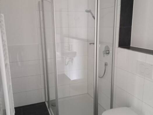1 großes Zimmer mit Einbauküche und großer Terrasse im Erdgeschoss. Zentrale Fußbodenheizung mit Luft-Wasser-Wärmepumpe/Erdgas. Offener Wohn- und Kochbereich, Bad mit Glaswand-Dusche, Flur, Terrasse. Raff-Stores an allen Fenstern. Außen-Stellplatz. Zur Wohneinheit gehört ein Abstellraum gegenüber der Wohnung. Im Kellergeschoss befindet sich ein gemeinschaftlicher Waschmaschinen- und Trocknerraum.