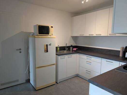 1 großes Zimmer mit Einbauküche und großer Terrasse im Erdgeschoss. Zentrale Fußbodenheizung mit Luft-Wasser-Wärmepumpe/Erdgas. Offener Wohn- und Kochbereich, Bad mit Glaswand-Dusche, Flur, Terrasse. Raff-Stores an allen Fenstern. Außen-Stellplatz. Zur Wohneinheit gehört ein Abstellraum gegenüber der Wohnung. Im Kellergeschoss befindet sich ein gemeinschaftlicher Waschmaschinen- und Trocknerraum.