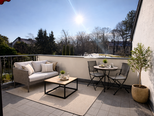 Diese hochwertig ausgestattete 3-Zimmer-Wohnung im 1. Obergeschoss überzeugt vor allem durch ihren großzügigen, lichtdurchfluteten Wohn- und Essbereich sowie die 30 qm große Dachterrasse mit Blick in...